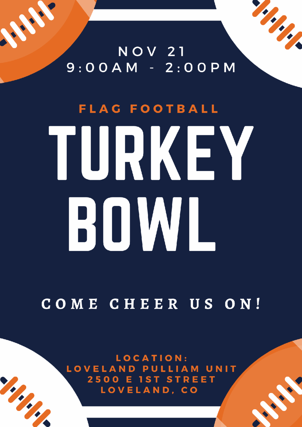 Tuesday, November 21st 9:00 a.m. – 2:00 p.m. Loveland Pulliam Club, 2500 E 1st St Loveland, CO 80537 Join us for the Turkey Bowl, our annual flag football tournament. Youth will have the opportunity to showcase their athletic skills and sportsmanship they have learned at Club! Interested in becoming a referee or a coach for this event? Email jboyle@bgclarimer.org. This event is brought to you by: |